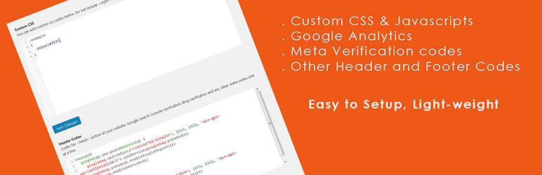 Add custom codes to your wordpress website. A Light-weight plugin to add custom CSS, Javascript, Google Analytics, Meta verification tags and other code snippets to your site. Go to Appearance -> Add Custom Codes after installing the plugin.