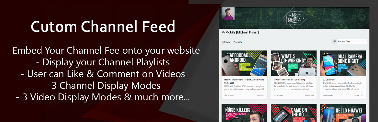 - 3 pre-designed Video Play Modes for your YouTube Channel feed