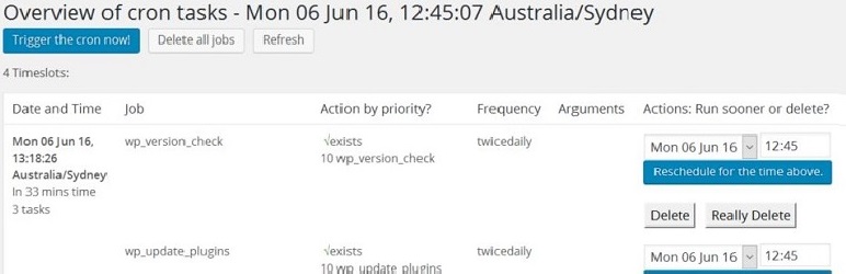 Overview of all cron jobs, showing whether the corresponding action is present. This is handy if you are struggling to write a plugin with a cron job. If there is no action created by the cron job plugin, nothing will happen – just delete the job.