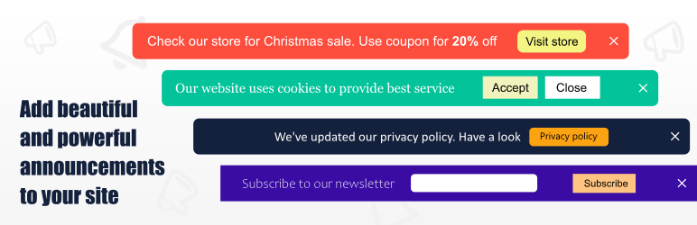 With Announcer plugin you can add beautiful and professional looking notification bars to your website. You can display custom message you want like promotions, cookie usage notes, welcome notes, privacy policy note etc. You can use this to increase user engagement in your website or boost sales and services.