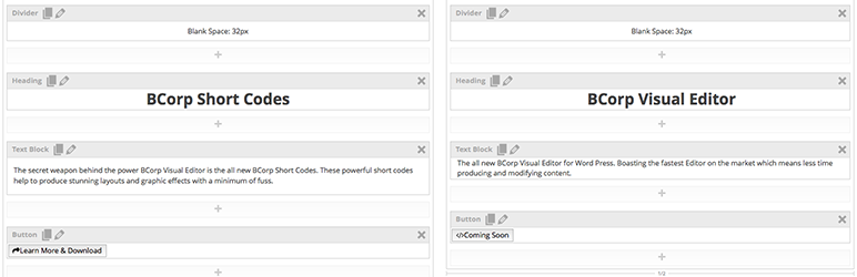 Powerful drag and drop page builder. Requires BCorp Shortcodes plugin installed and activated in order to function.