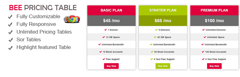 Pricing Table is a simple and user friendly responsive pricing table with fully customizable like header,pricing column,buttons and more.pricing table allows you to create unlimited pricing tables. publish pricing table on WordPress page or post content.Easy pricing table by easy admin panel to create tables and delete any pricing table and update. use via shortcode anywhere with your wordpress site.