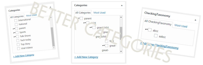 This plugin orgnizes the layout of categories boxes in the post add/edit screens and will work for all post types in your website. If you have a lot of categories in your posts and you face difficulties in creating posts because of a lot of scroll to select the appropriate category, then this plugin is for you.