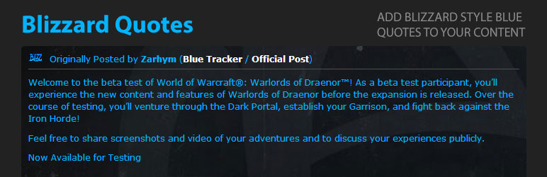 Add a blue quote to your post or pages like GM posts in battle.net forums with a great style, using [bluequote][/bluequote]. Updated options to customize background image, colors, radius,and more.