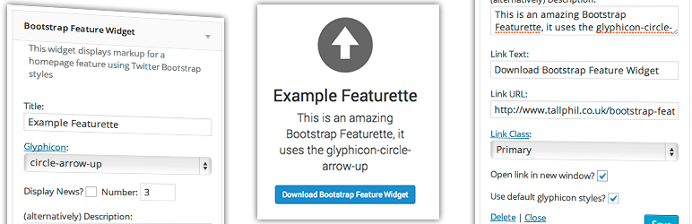 This plugin creates a Widget to display a featurette with a super-sized glyphicon, a title, content or latest posts and a link. The output requires Twitter Bootstrap to display properly.