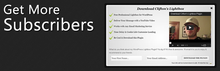 Clifton’s Lightbox implements a lightbox subscription form overlay. Features a title, list, call-to-action, and image or YouTube video. Users can embed their subscription form into the lightbox and use the call-to-action area to encourage new subscribers.