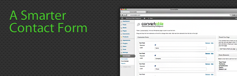 Convertable is the only plugin you will need to generate, track and manage leads with WordPress. In less than 5 minutes, you can build a contact form without having to know any HTML, get leads with real-time visitor tracking information (more detailed than Google Analytics) sent to your email, and update and manage your leads all within your WordPress dashboard.
