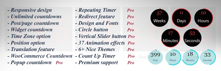 Our plugin has a lot of nice and unique features that you will like. You can add Repeating Timers, Popups, CountUps and much more. Also, our plugin integrated with WooCommerce, so you can use it on WooCommerce websites.