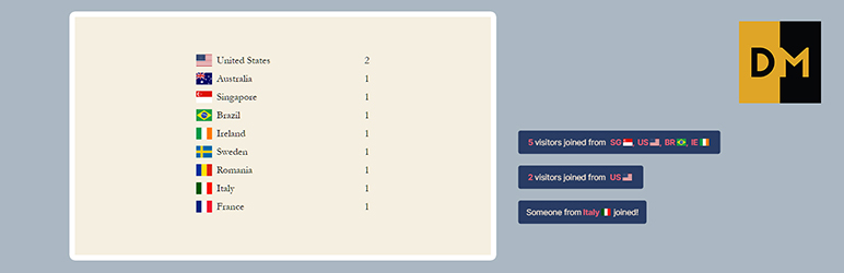 – [dm-vln-top-countries] – this one will show the top 10 countries that visited the page (only unique IPs will be counted).