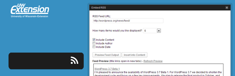 This plugin places an icon in the media row that allows a user to enter an RSS feed url, choose the number of items to display, and choose to display content, author or date for each item. It works via the use of a shortcode in the following format: