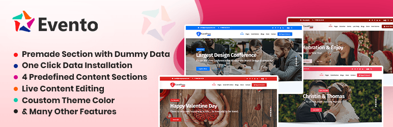Evento plugin is provides you a complete theme demo import setup for EventPress WordPress Theme. This Plugin Developed for only EventPress & Childs Theme. EventPress is Seasonal Themes.