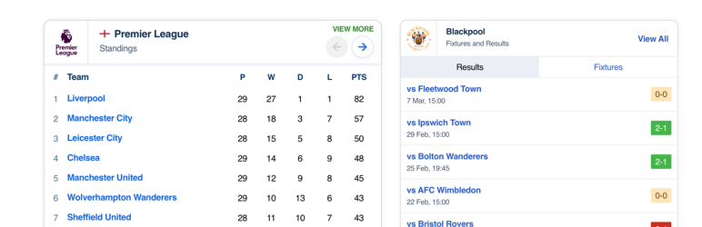 This plugin includes three widgets, with more launching in the coming months. These widgets pull in live-data from FootyStats.org and are designed specifically for your WordPress sidebar. Enjoy a live league table from over 750+ leagues across the world, or show a match preview for your favourite team, or a fully interactive widget of their latest fixtures and results.