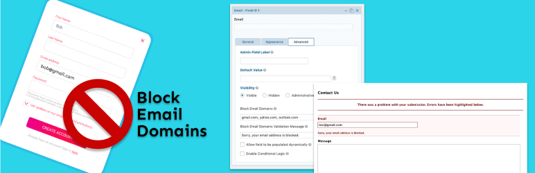 Gravity Forms Block Email Domains is an add-on plugin for Gravity Forms that allows you to define a comma separated list of email domains to block on each email field. Custom validation messages can be set as well. Blocked email domains will prevent the form from being submitted and prompt the user to enter a non-blocked email address.