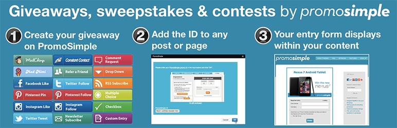 Create and customize all of your giveaways and sweepstakes within your PromoSimple account, including setting entry options such as ‘Liking’ a Facebook page or ‘Following’ you on Instagram, Pinterest or Twitter. When your giveaway is ready to go live, just add the campaign’s ID to the content of any page or post on your WordPress website using the PS button in the content editor. A shortcode will appear within the content editor and, once the page or post is published, your entry form will display within your content.