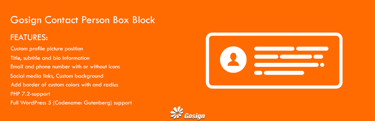 This plugin creates a contact person box block. It could be with custom profile picture position, with contact number and email, border and background color.