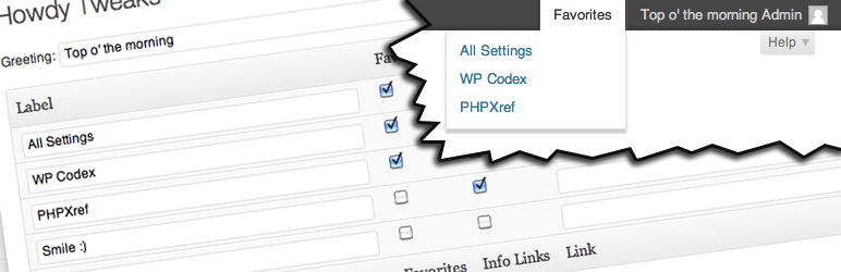 Change the “Howdy” greeting in the upper right-hand corner, as well add more links. Also add links to the Favorites drop-down.