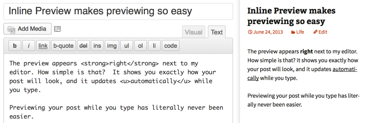 Inline Preview is a plugin for WordPress that adds a live preview of the current post next to the post editor instead of opening the preview in a new tab.