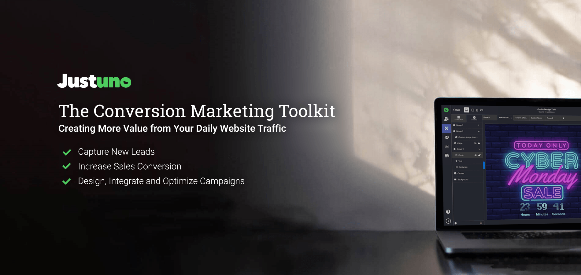 Justuno is the most advanced on-site visitor conversion platform on the market, utilizing billions of user data points to provide intelligent lead captures, personalized website messaging, and actionable insights that turn website views into conversions.