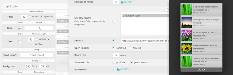 NewsBoard is a highly customizable jQuery News Ticker that displays your posts or rss feed from other sites. You can easily set width, height, colors, rollover colors, date format, thumbnail sizes, fonts, transitions, speed and much more.