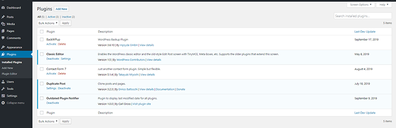 To use, simply install and activate the plugin. There is no additional configuration required. After, open the plugin admin page from your WordPress dashboard and you will see a new column displayed in the table: Last Dev Update. This column will indicate the last date the plugin was updated by its developer. If it has been several months–or years–since the developer last updated the plugin, you may want to contact the developer to confirm the plugin is still maintained. If the plugin is no longer in the WordPress plugin repository, Outdated Plugin Notifier will indicate so on the plugins admin page, and suggest you remove and/or replace the plugin.