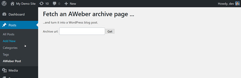 Just paste the url for the AWeber archive page into the AWeber Post screen (a submenu under Posts) and click Get.