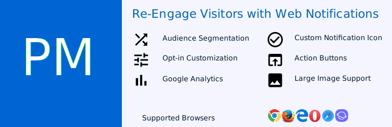 This plugin provides integration with Pushmix service. Activate opt-in prompt on selected pages to acquire subscribers audience. Once you have a build up subscribers audience you can start sending web push notifications directly from WordPress Dashboard.