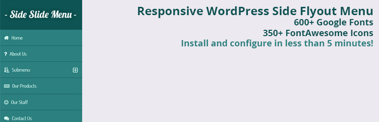 SideSlide Menu is a lightweight responsive WordPress side menu. It utilizes CSS3 transitions and Javascript (without jQuery) on frontend which guarantees good performance on lower – end mobile devices, while on better mobile devices and PC’s it is smooth as silk. All colors are customizable, so you can match your website visual identity perfectly.