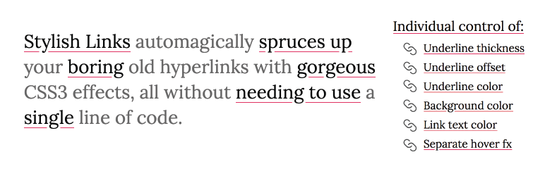 Ever been frustrated at the lack of flexibility for styling your hyperlinks? Ever wondered how sites like Pitchfork and Medium are able to dynamically style their links? If so, Stylish Links is for you! With the click of a button, automatically apply beautiful CSS3 styles to all of the existing links within your post and page content without conflicting with your current theme styles.