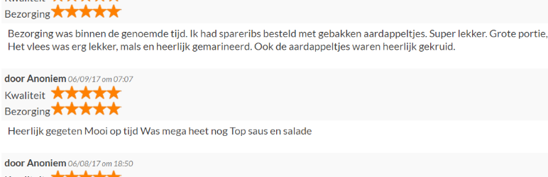 Met deze plugin laat je de Thuisbezorgd beoordelingen van je restaurant gemakkelijk zien op je WordPress website. Gebruik de [thuisbezorgd-beoordelingen] shortcode op de pagina waar je de beoordelingen wil hebben.