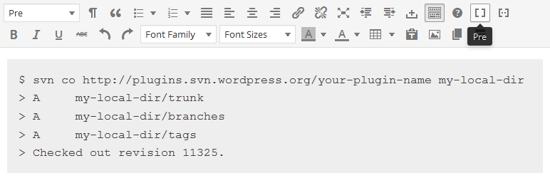 The Pre button toggles the preformatted style on the selected text or the current line (applies <pre> tag to blocks).