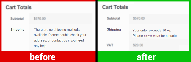 The plugin allows one to quickly customize the messages WooCommerce shows to the customer when shipping is not available: