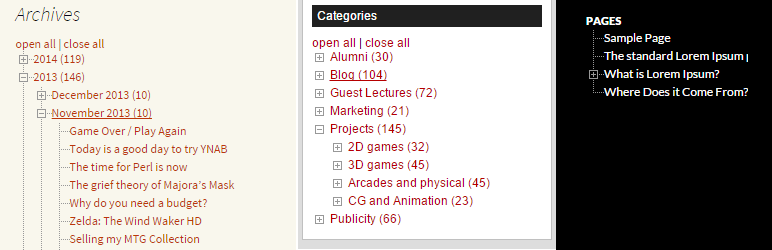 This plugin provides dynamic navigation trees to replace the standard archives, categories, pages and link lists. They’re widgets so you can setup the awesome tree navigation with drag & drop ease, but it also exposes several new template tags for developers.